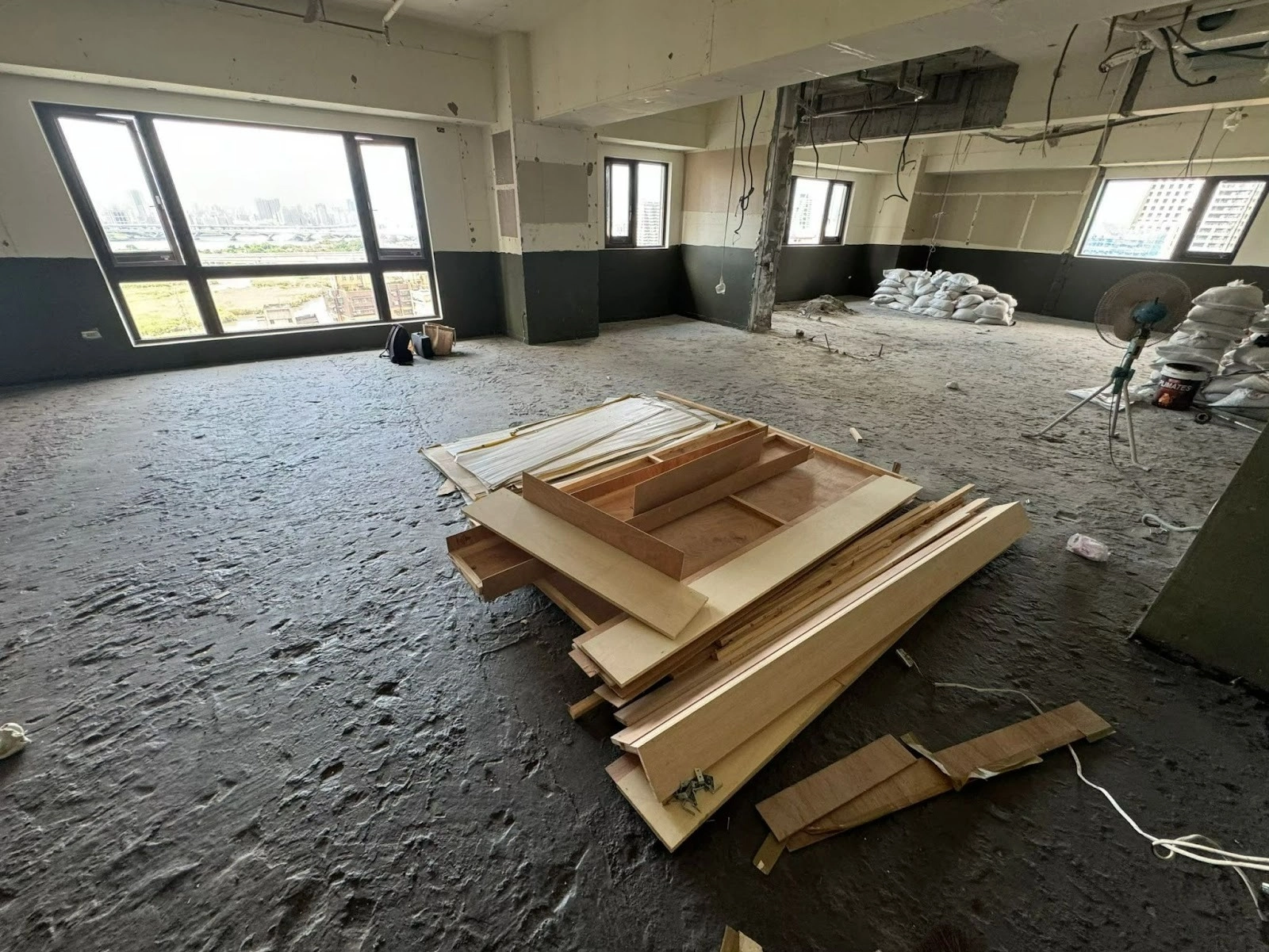 原拆除廠商在離地 120 公分以下牆面塗滿防水層,導致後續油漆與表面處理難度大幅提升。